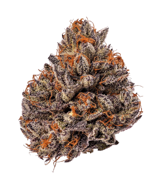 Visually, the buds are extremely colorful and eye-catching, often showing deep purple hues with bright orange pistils and a thick coating of frosty trichomes.