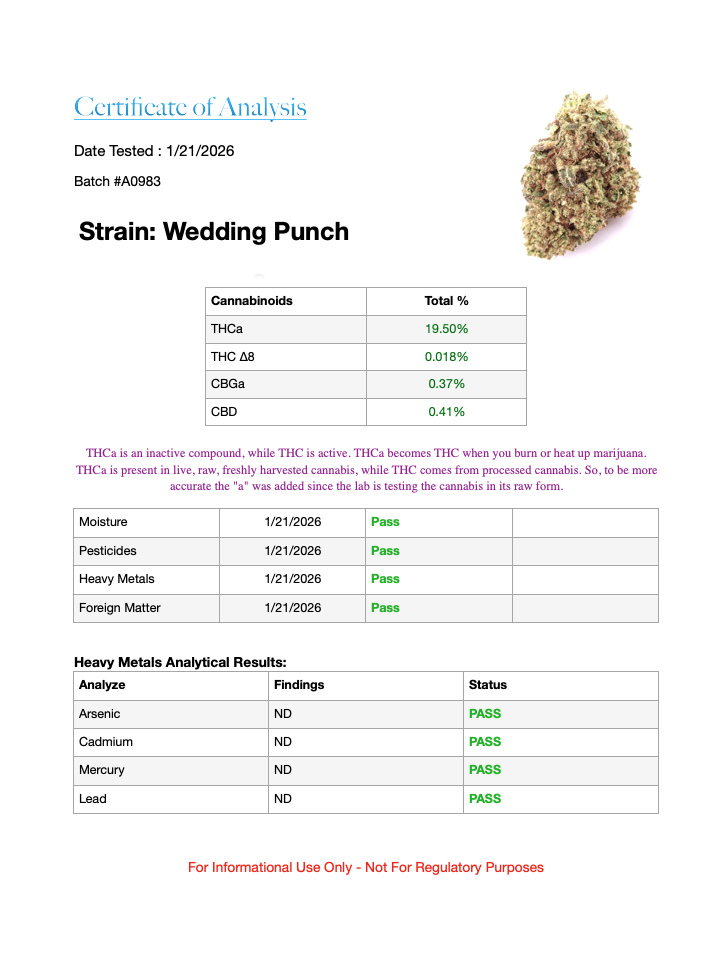 California Grown | Pesticide Free | Hybrid Wedding Punch is an evenly balanced hybrid strain (50% indica and 50% sativa) created through crossing the potent Wedding Cake and Purple Punch strains. If you’re after the perfect well-balanced hybrid with celebrity parentage, Wedding Punch was totally made for you. This bud packs a myriad of heady…