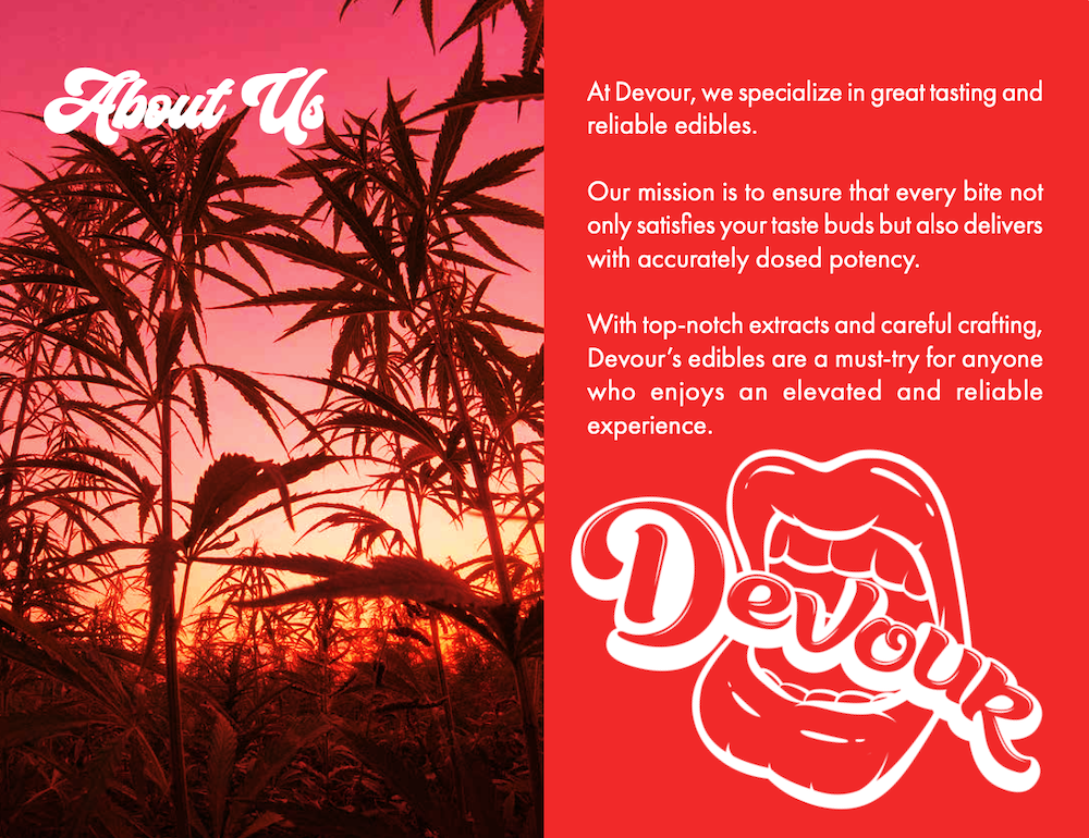 At Devour, we specialize in great tasting and reliable edibles. Our mission is to ensure that every bite not only satisfies your taste buds but also delivers with accurately dosed potency. With top-notch extracts and careful crafting, Devour’s edibles are a must-try for anyone who enjoys an elevated and reliable experience.