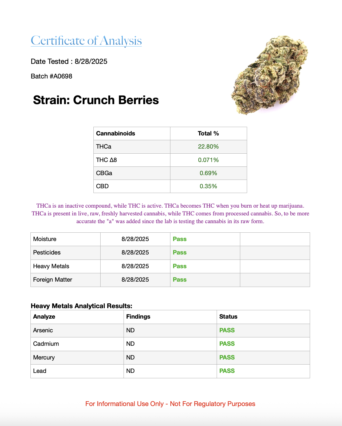 California Cat 3 Indoor Grown | Pesticide Free | 7 grams | Indica Hybrid Crunch Berries is an indica dominant hybrid (70% indica and 30% sativa) strain created through crossing the Triple OG and blueberry strain. This bud is infamous for its flavor that is said to be exactly like Crunch Berries cereal! It has…