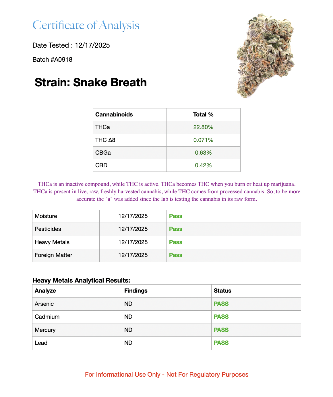 Snake Breath is an indica dominant hybrid strain (70% indica and 30% sativa) created through crossing the potent GMO and Mendo Breath strains. This tasty bud offers a uniquely savory flavor with happy, soothing effects that will have you feeling ready to settle in and get to sleep. The flavor of Snake Breath is much like what you’d expect, blending together spicy skunk with herbal, garlicky sage. The aroma take sit up a level in the spiciness department, throwing in added layers of heavy black pepper to the mix. The Snake Breath high will hit you slowly, filling your mind before creeping into your body with budding potency. You’ll find your mind lifted into a place of happy euphoria that pushes out any negative thinking to speak of. Your body will suddenly drop off into a deep relaxation that can be a bit sedative and sleepy at times. With these effects and its super high average THC level, Snake Breath is often used to treat a variety of conditions including chronic pain, insomnia, depression, chronic stress and cramps or muscle spasms.