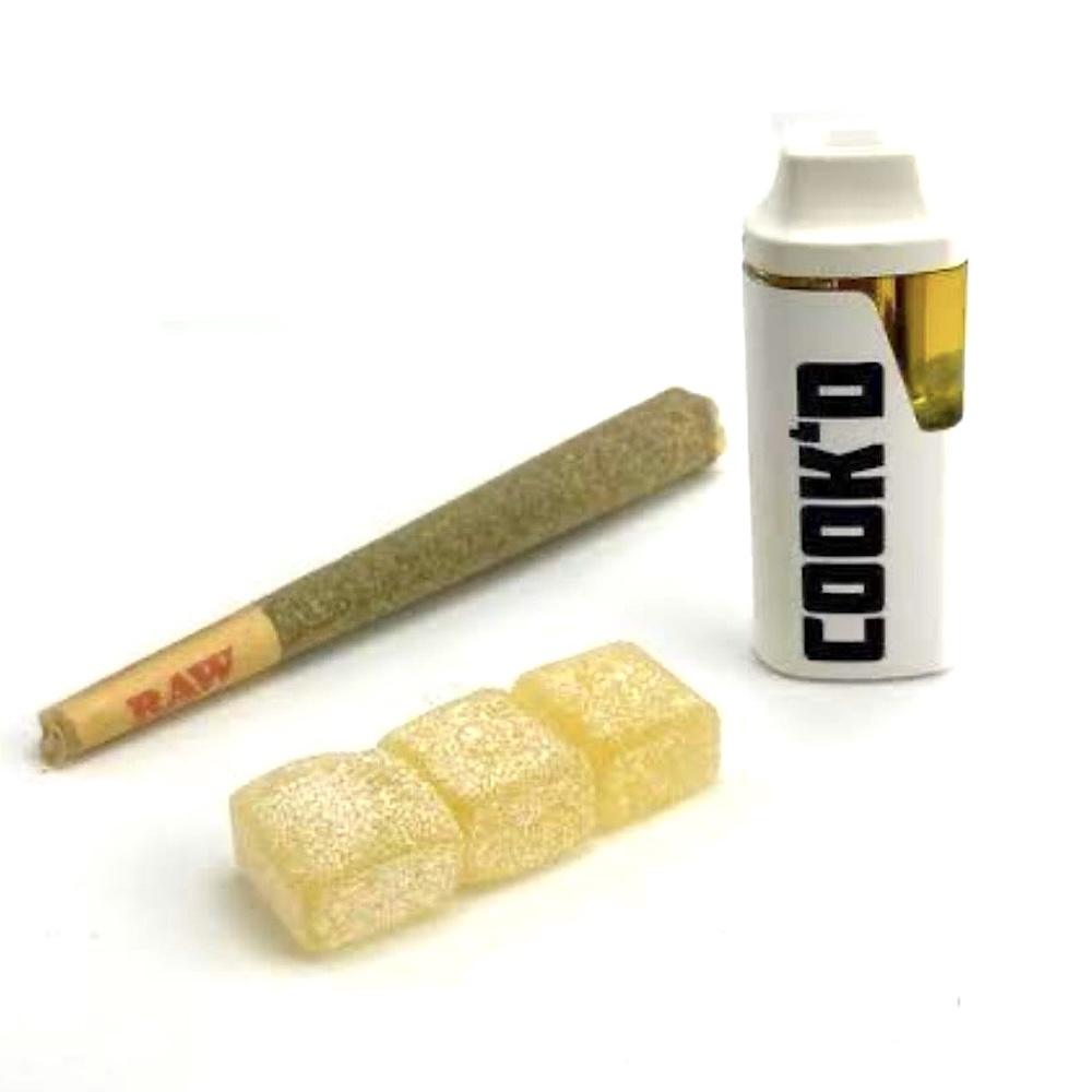 Cook’d Premium Live Resin + Diamonds Vape | 1 Disposable 2g Vape Cart | 1g Pre-Roll | 3 edibles 20mg Each